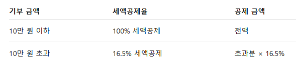 - 10만 원 기부 → 10만 원 전액 세액공제