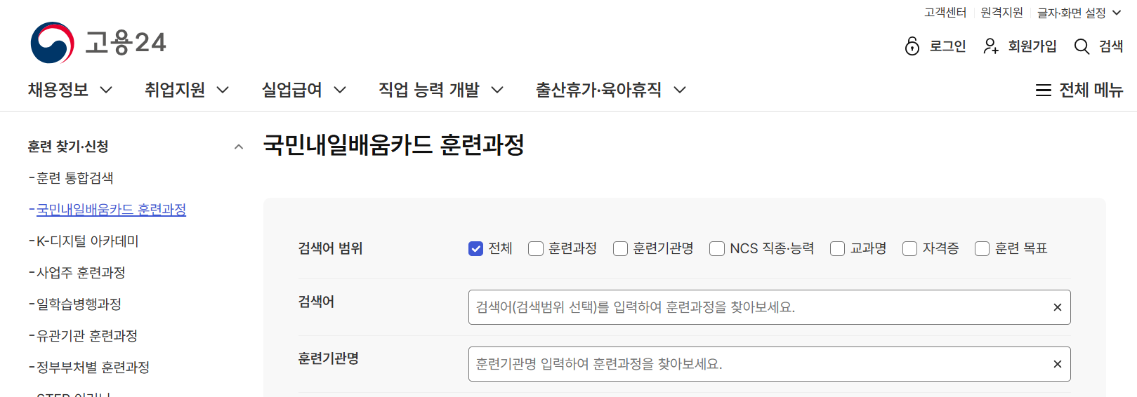 - 실물 카드 수령 후, 고용24 또는 HRD-Net에서 훈련과정 검색