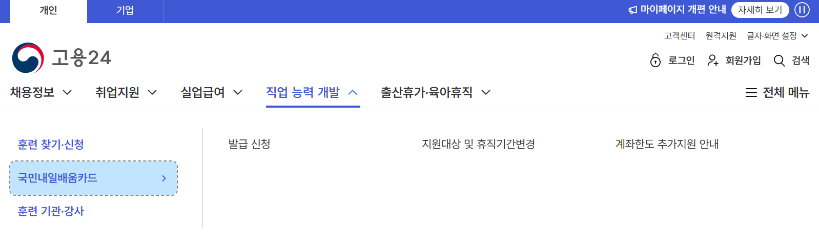 - 고용24 홈페이지 접속 → 국민내일배움카드 메뉴 선택
